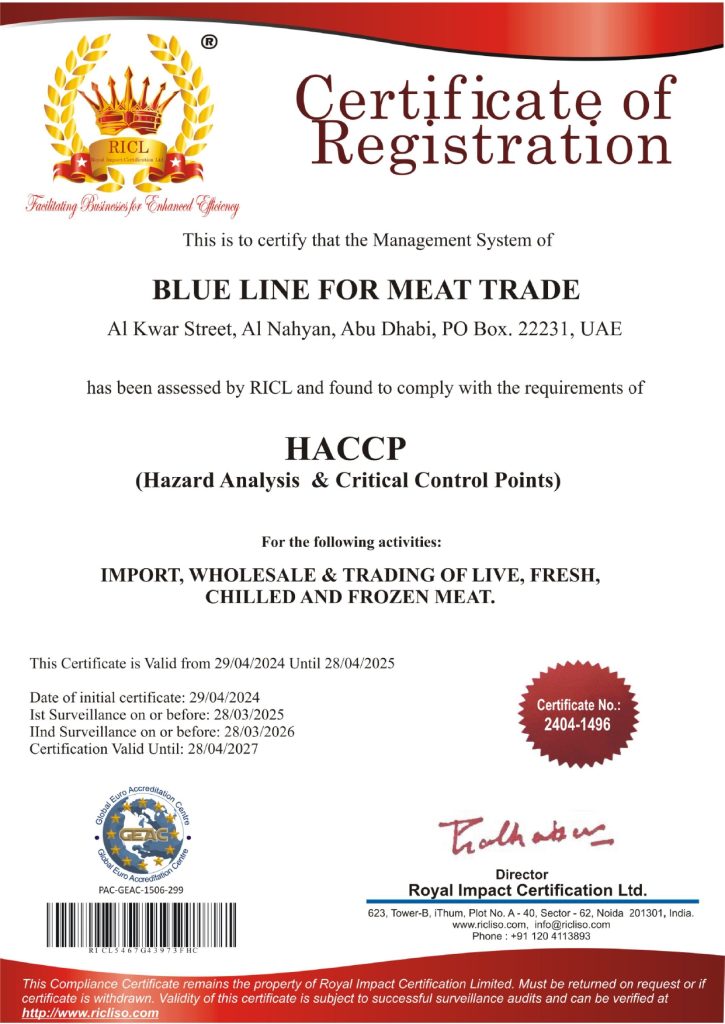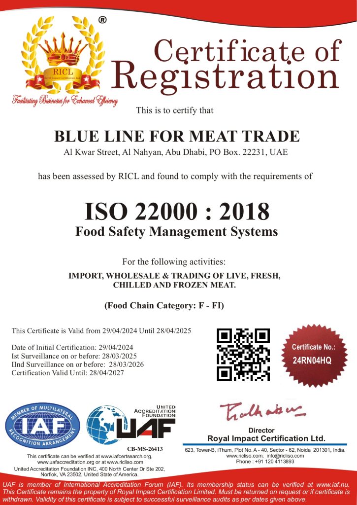 Blue Line follows the highest international standards in all its business sectors in order to enhance the services and products it provides to its clients and customers on a regular basis throughout the year. We seek to develop and improve our systems for managing the quality of foodstuffs over the years. Therefore, we have well deserved international certificates in the field of meat import and quality management, such as the HACCP certificate. And ISO 22000 certificate